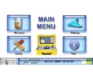 Programing the LISST-Portable is easy. The Main Menu offers four different submenus. The Sequoia button in the bottom left corner will always return the user to the main menu. When the mixer is running the mixer icon lights and the battery icon displays remaining battery power.