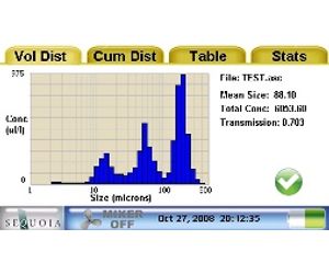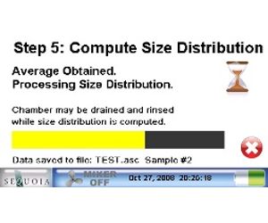 As soon as the average has been obtained the size distribution is computed. This takes 45 seconds and in the meantime the user can drain the mixing chamber and clean it, so that it is ready for the next sample.