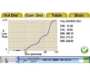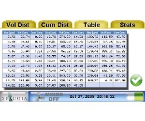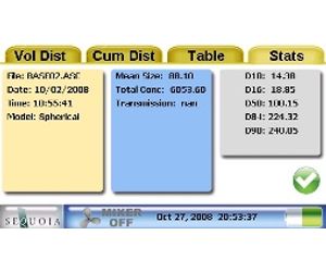 The stats tab has more detailed information and listing of auxiliary parameters. Numerous parameters are computed and stored with the ASCII file, suchas the voluem concentration in each size bin, mean and median (D50) grain size, D10, D90, D16, and D85grain size, standard deviation, surface area, optical transmission,total volume concentration, and the volume concentration in the <64µm size range.