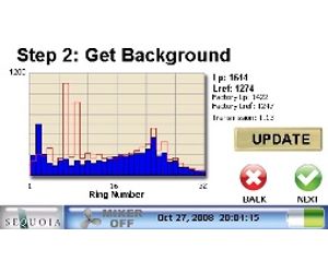 Once the mixing chamber is sufficiently clean, a clean water background (zscat) measurement is obtained and compared to the factory background measurement. Clicking the update button will cause a refresh of the background measurement if the previous one was not satisfactory. A warning is displayed if the background (baseline) measurement is not of sufficiently highquality.