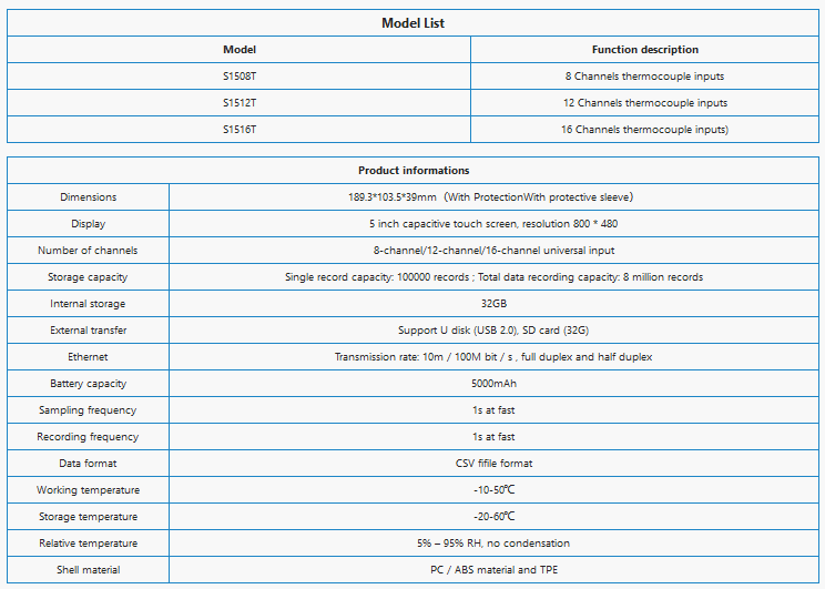 S1500 portable multi-channel thermocouple data logger support Max 16 channels input and multiple thermocouple types simultaneously . This device achieve real-time viewing of multi-channels on device and web page(RJ45 LAN ) synchronously. It is an integrated and intelligent recorder.It also has the functions of external data transfer, web page viewing, RJ45 and so on. It is an integrated and intelligent recorder.