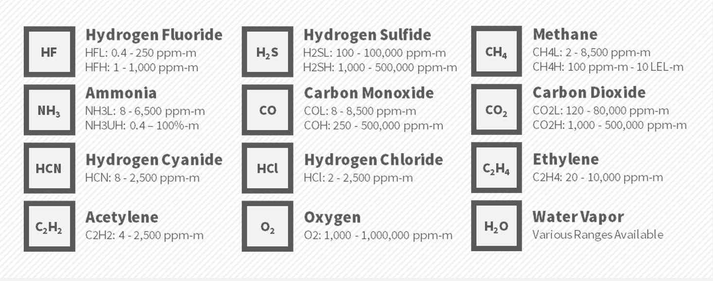The table below shows both the gases and ranges that can be used with the GasFinder3-MC.