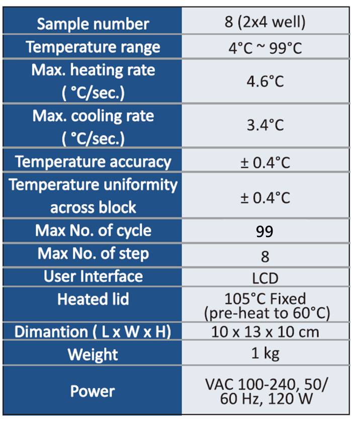 Qampmini is designed to achieve polymerase chain reaction (PCR) for the amplification of the targeted DNA in a miniature device making molecular biology more fun in the field. With the Peltier heating & cooling module positioned at the center total of 1-8 samples can be analyzed efficiently and cost-effectively without sacrificing performance and quality. With it`s compact size and One-Click to Go design, Qampmini is ideal in the field, laboratories or classrooms for epidemiology, veterinary, food testing, pathogen detection, ecology, archaeology research and education.