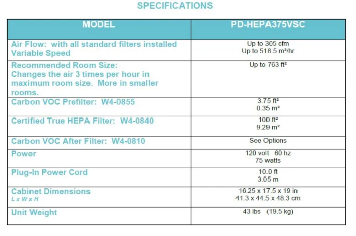 - Powerful European Motor with variable speed delivers up to 305 cfm of filtered air.
