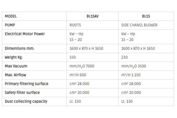 Portable vacuum cleaner suitable to be used in the heavy-duty industries. Wherever there is bulk material to handle, abrasive material or material recovery, BL unit finds his application. As standard it comes with 130 lt. capacity dust tank, tangential inlet as pre-separator and filter protection, main filter in Polyester material 550 gr/m3 with electric shaker cleaning system, air cooling filter protection (AV series only), safety cartridge at pump inlet ( AV series only), additional silencers, electric Board control for Start and STOP and emergency stop. All the BL units are supplied to operate with electrical voltage V 400, three-phase, different electrical voltage can be supplied upon request and quoted separately. Plug 32A. and electric cable are supplied with the unit.