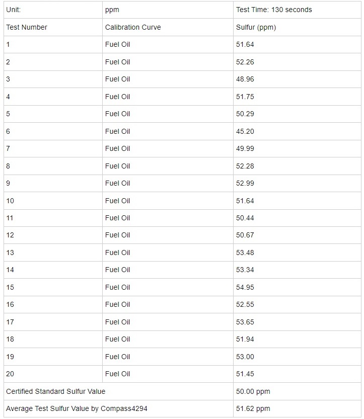 To study the accuracy of Compass 4294, ten measurements were performed on a commercially-available fuel oil reference material containing 50 ppm of Sulfur.