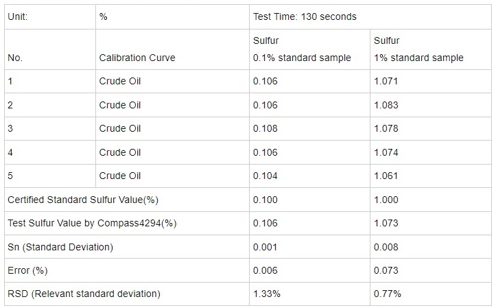 To study the precision of Compass 4294, two crude oil samples of sulfur with certified value of 0.1% and 1% were analyzed. The results shown below demonstrate that Compass 4294 delivers precise measurements across a wide range of hydrocarbon sample.