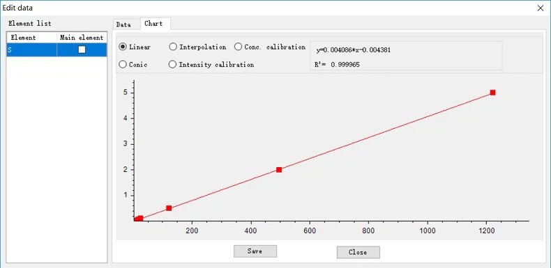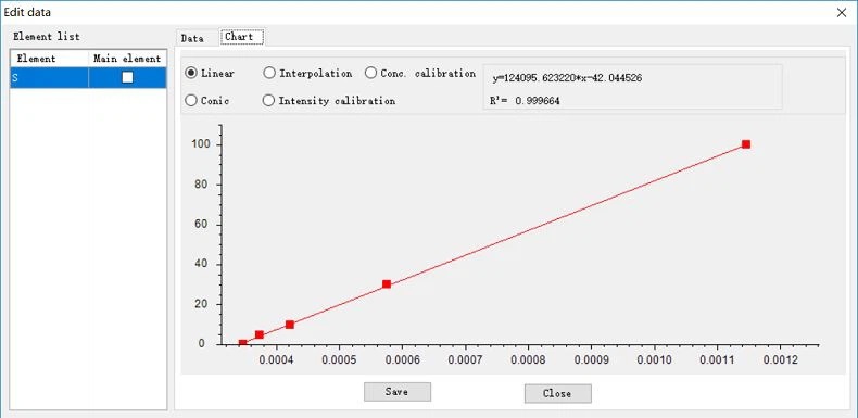 The red points are sulfur standards: Blank, 0.01%, 0.075%, 0.1%, 0.5%, 2% and 5%. The perfect R2 value(0.999921) demonstrate the good linear with wide concentrate range of sulfur.