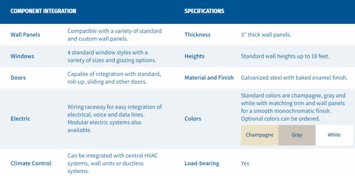 Color coordinated panels, studs, doors, and trim, bring a professional “front office” finish to OmniFlex in-plant buildings. Standard colors are champagne, gray and white with matching trim and wall panels for a smooth monochromatic finish. Optional colors can be ordered.