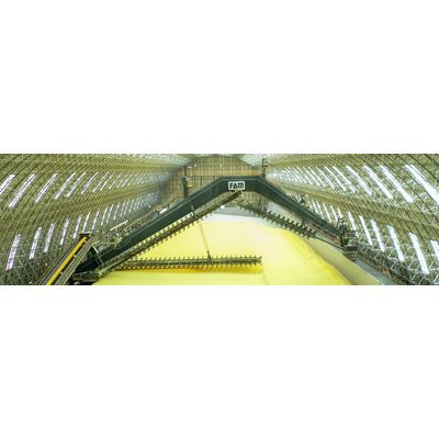 The portal of an FAM portal scraper fully spans the stockpile. It rests on two opposite undercarriages, allowing stockpiles of up to 75 m wide to be spanned. The scraper boom is moved by a hoist.