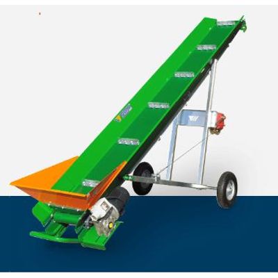The inclination of the conveyor belts can be adjusted with a manual winch. The pneumatic-tyre wheels and the standard tractor drawbar (comprising of drawbar, rear reflector and adhesive sticker for 6 km/h) gear the conveyor belts up for easy transportation.