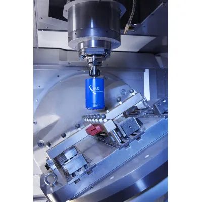The Position Inspector consists of a cross shaped artefact that is placed on the machine table and a wireless measurement probe that is inserted in the spindle. The artefact consists of 13 precision balls whose position is known with sub-micron accuracy. The cross is aligned with two of the machine’s linear axes and the machine is commanded to move the probe to each of the balls in a set sequence. The probe measures the error that occurs in positioning of the probe in X, Y and Z directions, and hence calculates the linear axes errors. The artefact can be pallet mounted and the probe placed in the toolchain.