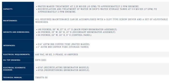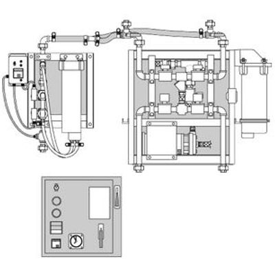 Consists of two rugged, below-deck, bulkhead-mounted, brominator assemblies, manifolded together with flexible hose. All-bronze pump and corrosion-resistant fittings used throughout. Storage tank alignment is via solenoid valves activated by a switch on the control panel, which also includes pump start/stop, tank selector switch, and bromine feeder status indicator. Time totalizers keep track of total cartridge usage. Our patented Total Bromine Control System is available as an option with this unit. This system automatically controls the bromine level in the ship’s water storage tanks and alerts ship’s personnel when the bromine cartridges are depleted.