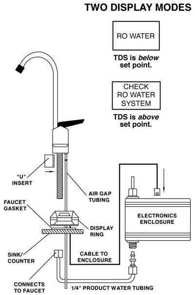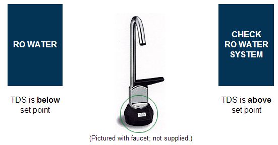 The innovative Myron L RO-CHECK (U.S. Patent # 4,762,611) reliably monitors total dissolved solids 24 hours a day. A quick glance at the display assures RO users of their water TDS quality. Should membrane failure or other problems cause TDS to rise above the set point, the words “CHECK SYSTEM” flash in the LCD. This silent indicator alerts, rather than alarms, the user that service may be required. Easily installed on most popular faucets, the RO-CHECK features 16 set point choices and is ideal for monitoring water of almost any TDS quality.
