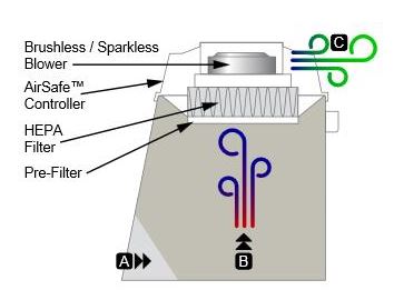 - Brushless, sparkless blower is post-filter