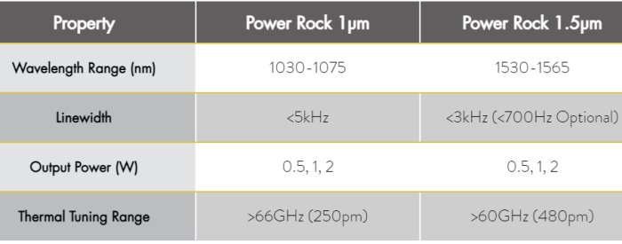 Output Powers 2W and above; Narrow Linewidth 700Hz; Ultra-Low Phase-Noise; Excellent Frequency Stability; Broad Mode-Hop-Free Tunability; Low sensitivity to Acoustic Noise.