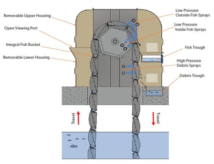- Hydraulically optimized fish buckets and high net panel efficiency reduce velocity and head loss.