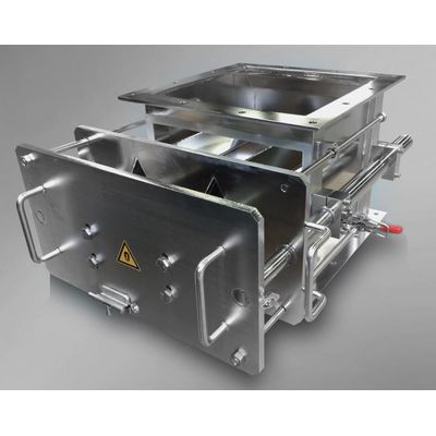 Powermag is a powerful magnetic separator used in the food industry to capture even the finest ferrous contaminants from dry, powdery products. Installed in hoppers, pipelines, or chutes, Powermag uses high-strength magnets to ensure that metal particles are effectively removed, protecting product quality and processing equipment. Its robust design is suited for high-capacity production lines, and its easy-to-clean features simplify maintenance, minimizing downtime. By preventing metal contamination, This magnetic system helps food manufacturers meet stringent safety and quality standards, making it an ideal solution for handling powders, spices, flour, and other fine-grain products.