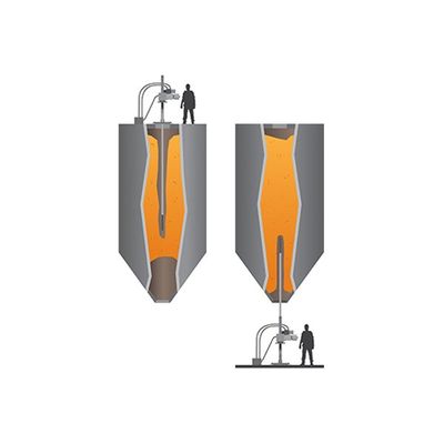 Diameter for storage units from the top or bottom: 65 to 300 mm. Intervention depth: Up to 45m. Controlled from outside. All types of storage units. All types of materials. To be used before GIRONET. 2 versions: Pneumatic: for friable products (coal, bran, sugar, ash etc.). Hydraulic: for hard products(slag, cement, sulphate carbonate etc.).