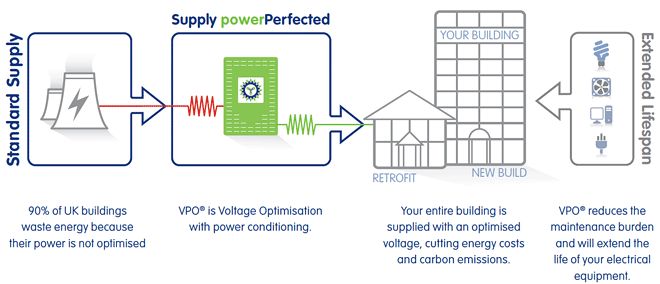 VPO optimises a site`s power supply to provide financial, energy and carbon savings - simultaneously correcting the problem of over-voltage on the supply network and improving the quality of power entering your building.