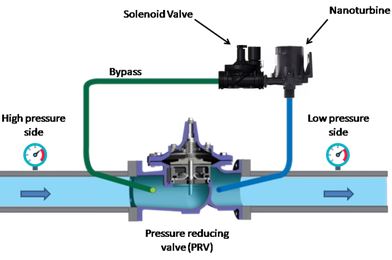The nanoturbine for battery charging has been specifically designed to be installed in parallel with pressure reducing valves (PRVs). Its compact size, high life span and water resistance (IP68) make the nanoturbine the ideal solution for power supply in any location without electric connection. Thanks to its 20W power, it is possible to supply dataloggers, flowmeters, pressure sensors and all kinds of instrumentation necessary for remote monitoring of a pressure reducing valve without affecting its operation, since the water turbine is installed in bypass using only a small part of the flow.
