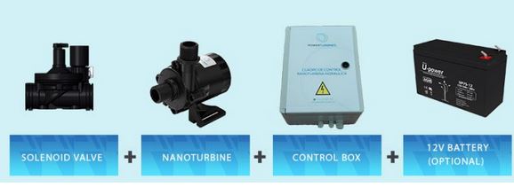 It is supplied as a kit composed by the nanoturbine, the control box (including a 12V battery charge regulator) and an ON/OFF solenoid valve in order to make the water turbine work only when the battery needs to be charged, reducing significantly the running hours and increasingly life span. Optionally the kit can be completed with the battery (12V lead acid standard battery up to 45 amp-hour of capacity) as well as a 12-24VDC converter in case you need to supply 24V equipment.