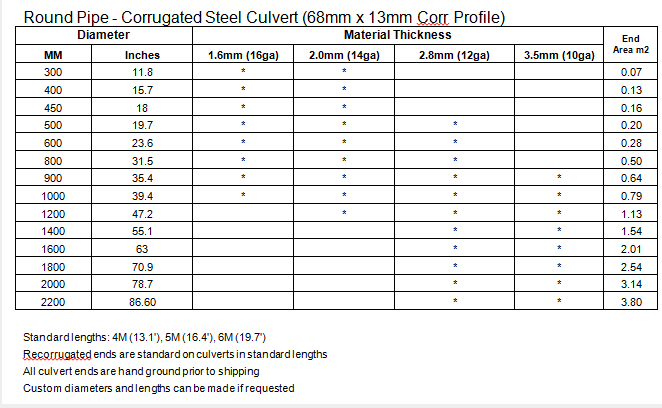 Small diameter culverts are manufactured in the following diameters and material thicknesses.