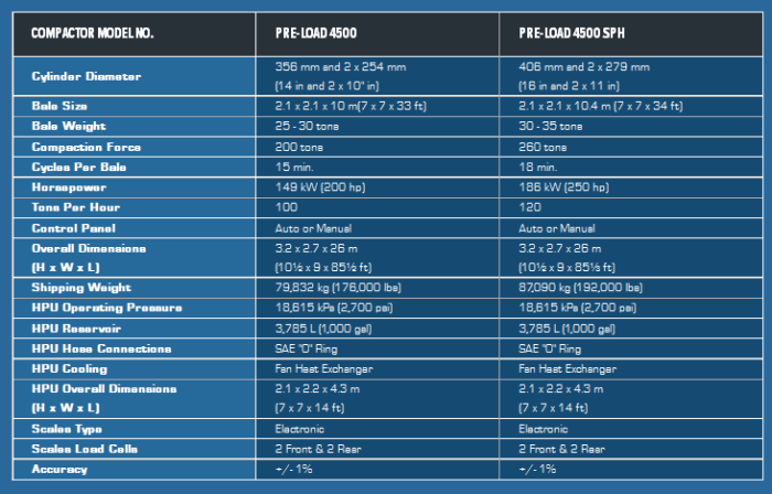 SSI`s 4500 Series of pre-load compactors are the optimum solution for high volume transfer station facilities requiring more than 300 tons per day of throughput. SSI`s Pre-Load 4500 Series stationary compactors feature three single stage cylinders designed to form one high density square ended bale for transfering municipal solid waste, recyclables, or other commodities into highway and intermodal trailers or containers. This increases throughput for the same horsepower of other compaction systems.