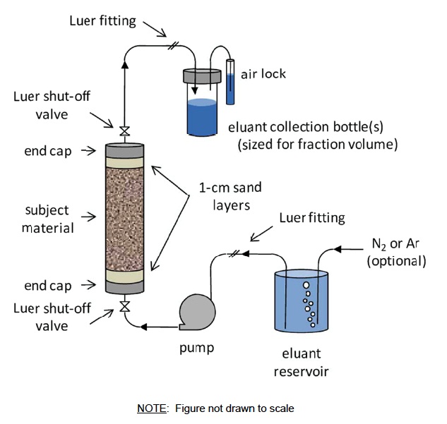 Solid material is loosely packed into a borosilicate glass column and contacted with a percolating leaching solution at low flow rate. The flow rate is maintained between 0.5-1.0 LS/day to increase the likelihood of local equilibrium between the solid and liquid phases, due to residence times longer than 1 day. Liquid is pumped in an up-flow direction to minimize channel and air entrapment. Eluates are collected at specific cumulative L/S values between L/S 0.2 and 10 mL/g-dry. Eluate concentrations and constituent cumulative release plotted as a function of L/S.