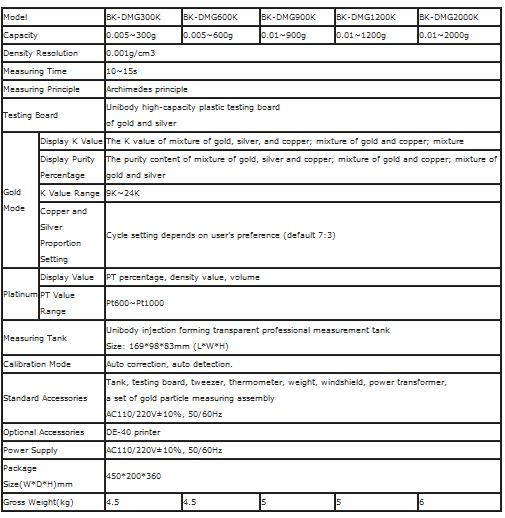 - Top and bottom limitation of K value, purity and density of gold. And prompt alarm.