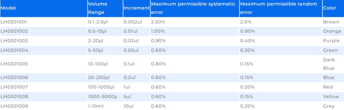 - Volume range of 0.1ul-10ml identified by different color tops