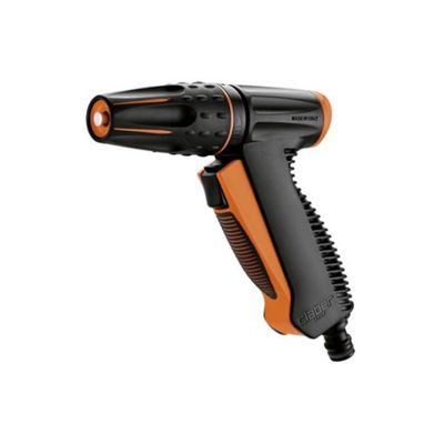 Spray pistol with new anatomical rubber grip and convenient front on-off flow button. Knob at rear adjusts strength of water jet. Cap with rubber lining for protection against impact. Water flow can be adjusted as required, from completely closed (concentrated) to completely open (fan spray).