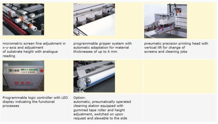 - infinitely and separately variable squeegee and flood coater speed adjustable via potentiometer and pneumatically adjustable pressure