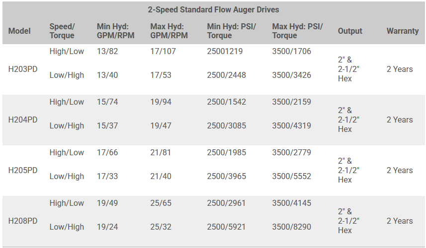 Premier’s Two-Speed Auger Drives are designed for contractors who need a perfect balance of torque and speed to handle varying ground conditions. These advanced drives automatically Shift on Demand—engaging high torque and low RPM for tough conditions like rock, then seamlessly returning to low torque and high RPM when digging becomes easier. No manual or electrical shifting is required, and no case drain is needed.