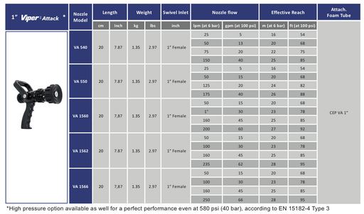 Service and Maintenance:The VIPER ATTACK® nozzle requires minimal maintenance during operation provided the unit is regularly flushed with clean water after being used with foam or contaminated water. Service kits are also available.