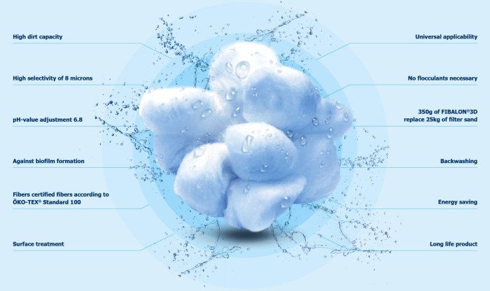 FIBALON®3D is the origin for crystal clear water and provides the best results at a filtration speed of 30 m / h (according to DIN 19605). The backwash speed should be based on the filtration speed.