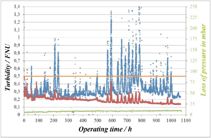 The first impressions count: Turbidity is not a physical quantity but a subjective impression. Despite the filter run time of over 1.000 hours, FIBALON® ensures crystal clear water. The measured values were during the entire operating time significantly below the statutory limit of 0.5 FNU (Formazine Nephelometric Units, measuring by scattered light (angle of 90° in accordance with ISO 7027)).