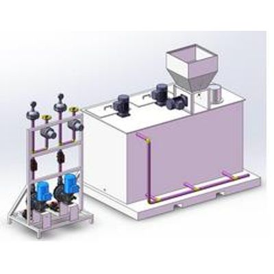 The preparation tank is divided into three sector: dissolving V1,maturing V2 and storage V3,interconnected by siphons that form a preferential path necessary for the formation of a top quality solution. The powder form the dosing unit is mixed with water ,which ,appropriately sprayed ,from a nozzle, carried out the important action of dispersion.