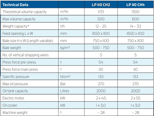 * At a material pre-bale density of 30 - 100 Kg/m³