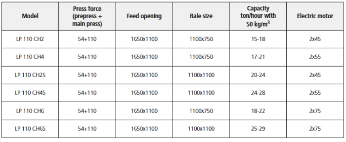 This baler is ideal for high-material throughput applications. The LP 110 baling press is, like all our models, extremely robust, reliable and durable. The baler is available in two versions in regards to the bale size: LP 100 CH: H 1100 x W 750 x L variable mm. LP 100 CHS: H 1100 x W 1100 x L variable mm. The LP 110 can process up to 55 tonnes/hour and has a combined press force of 164 tonnes.