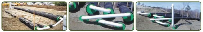 - Snap-lock couplings, offset adapters, PVC piping and end caps are used for system assembly.