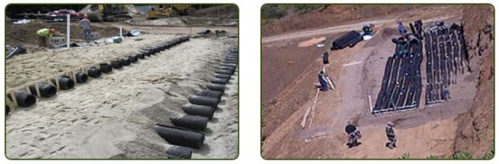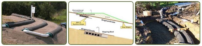 The Advanced Enviro-Septic® (AES), Enviro-Septic® (ES), and Simple-Septic® (SS) Wastewater Treatment Systems are versatile products that offer a great number of installation options. Enviro-Septic® Technology can be used in many configurations and requires a smaller area than conventional leaching systems. A 10 ft. length of AES, ES or SS pipe can be bent to 90 degrees allowing a variety of unusual system shapes such as curved, trapezoidal, L, S, or U-shaped. Enviro-Septic® Technology may be installed on sloping sites! Advanced Enviro-Septic®, Enviro-Septic® and Simple-Septic® Systems can be installed sloping within the slope (see below), saving great expense in fill and construction time.