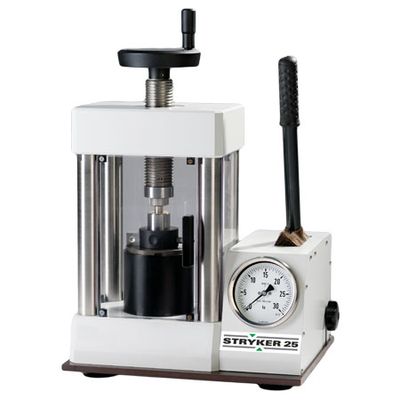 The preparation of solid pellets requires a hydraulic press. Together with a die it is possible to create a stable pellet from loose powder. Depending on the material, the use of a binder or an aluminum cup is recommended. The most common size and diameters used for XRF are 32 and 40mm. Based on the fact that pressure is force per surface it is recommended to use at least 15 tons for 32mm and 25 tons for 40mm.
