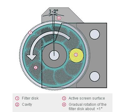 When a pressure increase upstream of the filter due to contamination is registered, the filter disk is indexed by means of a pneumatic drive. This guarantees that the free screen area is always kept constant and that the pressure variation in front of the filter is < 1.5 bar.