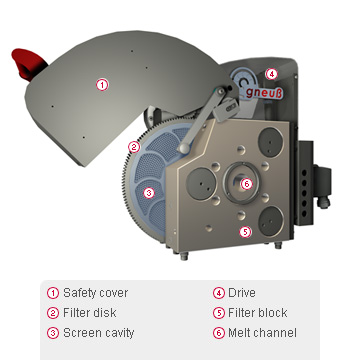 The filter disk – on which the screen cavities are located in a ring pattern – rotates between the two filter blocks. To change the screens, the safety cover has to be opened. The production process is not disturbed by the screen change procedure. Thanks to the modular design of this filtration system, it is possible to replace the few wearing parts (such as heater elements and bearing bushings) during operation. Continuous production over many years is thus made possible.