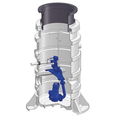 VARIANT pump station for one- and two-family houses: Robust polyethylene LDPE shaft. Covers up to class D (truck passable). Pumps with traverse suspension. Single or double unit. Armatures in DN 40. Armatures cast iron or stainless steel. Buoyancy control (optional). Fully electronic control unit. External column or building installation of the control unit. Flushing connection (optional). Vacuum breaker (optional).