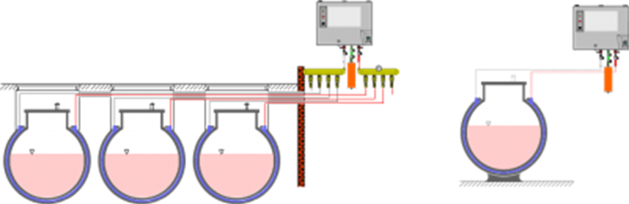 - double-walled tanks with a test pressure of the interstice of min. 400 mbar (e.g. applicable tanks in accordance to the EN standard). Maximum pressure of the stored liquid to the bottom of the tank: 200 mbar.
