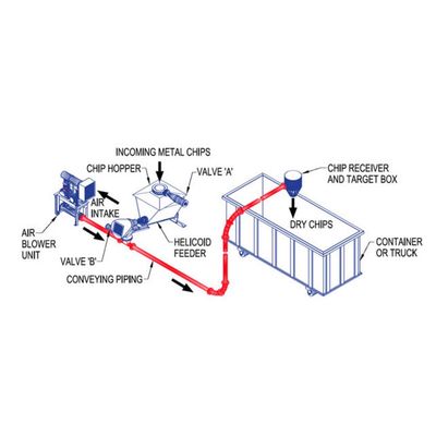 Referring to the diagram shown above, incoming metal chips (from chip wringing operations or other sources) are fed into the system airlock feeder through valve "A" filling the chip storage hopper. Valve "B" is closed. When the hopper is full, valve "A" closes, valve "B" opens, and a helicoid (screw) feeder fitted to the hopper bottom provides a metered stream of chips into the pneumatic conveying pipeline. For short distance conveying, a self relieving, anti-jam rotary airlock feeder can be provided. Metal chips are normally conveyed to a distant chip receiver/target box (located above a roll-off container or truck) where chips are separated from the airflow. Alternatively, chips may be delivered to a storage silo for subsequent loadout. An upstream mechanical blower unit provides the pressurized airflow for conveying of metal chips.