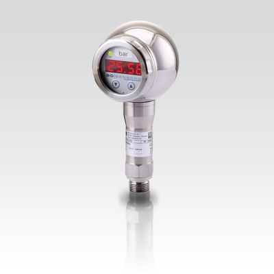 As standard the DS 400 offers a PNP contact and a display module, which is mounted rotable in the ball housing. Additional optional versions like e.g. an intrinsically safe version, a second contact and an analogue output complete the profile.