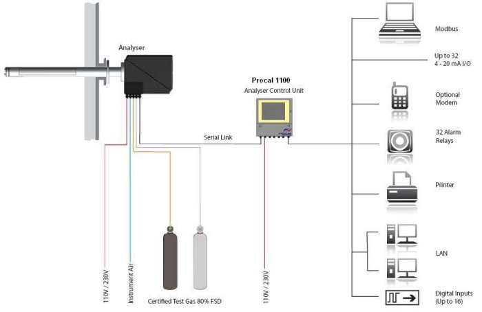 A typical system comprises a stack mounted analyser, an integral calibration function and a Control Unit with options which include a powerful in situ Heater and a stand-alone Analysis Software package.